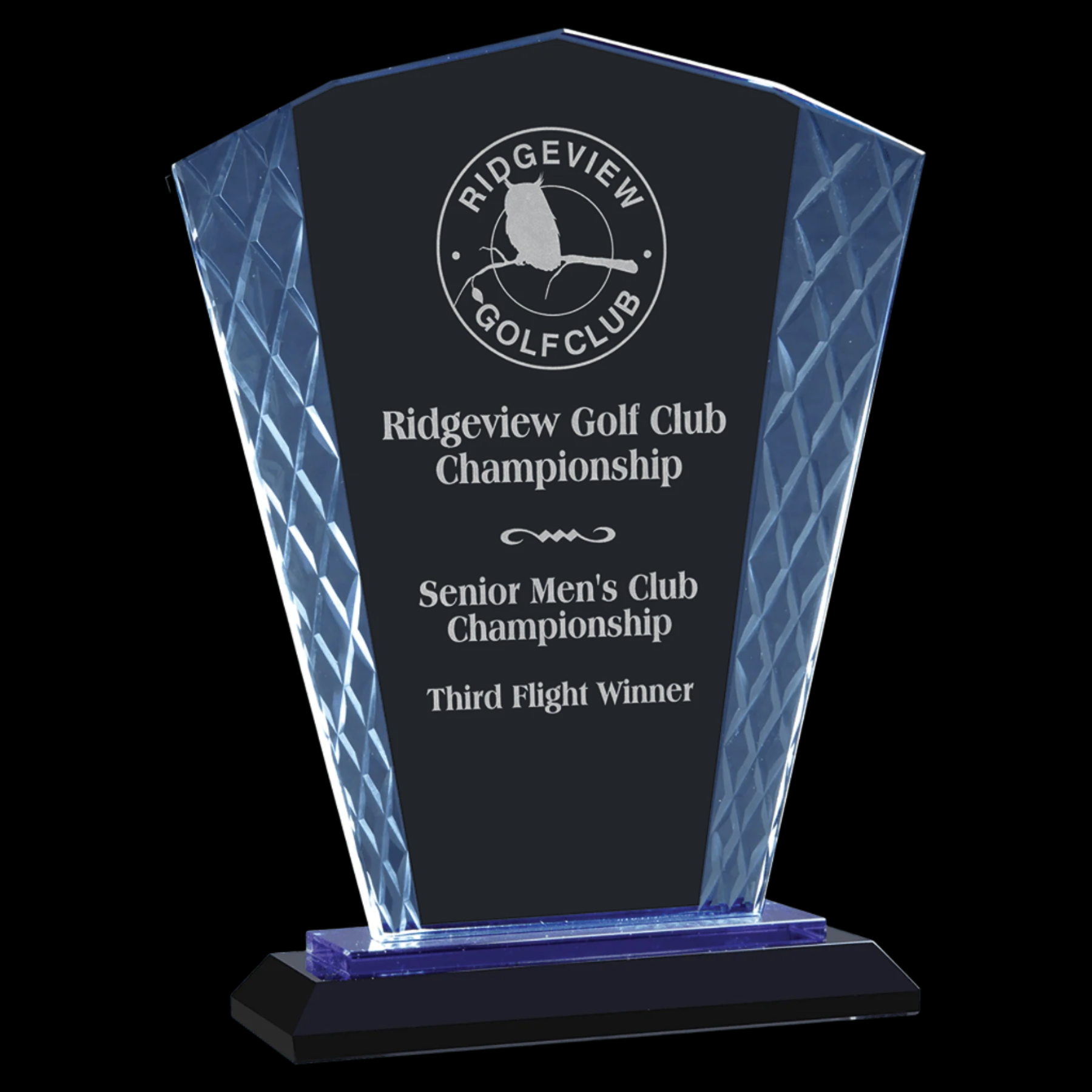 Fan Shaped Accent Glass features a distinctive design mounted on a sleek black and blue glass base. Crafted with .375" thick glass, this piece offers durability and visual depth. Available in multiple sizes and colors, it provides versatile options to complement various décor styles with expert precision.