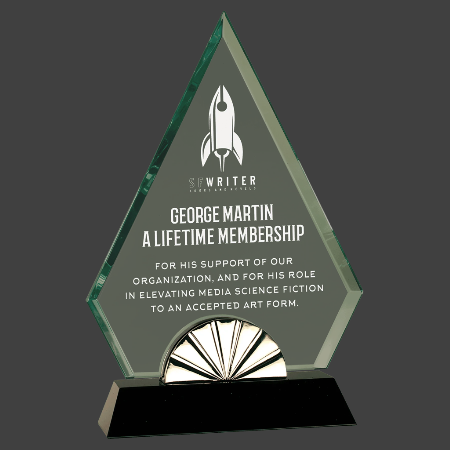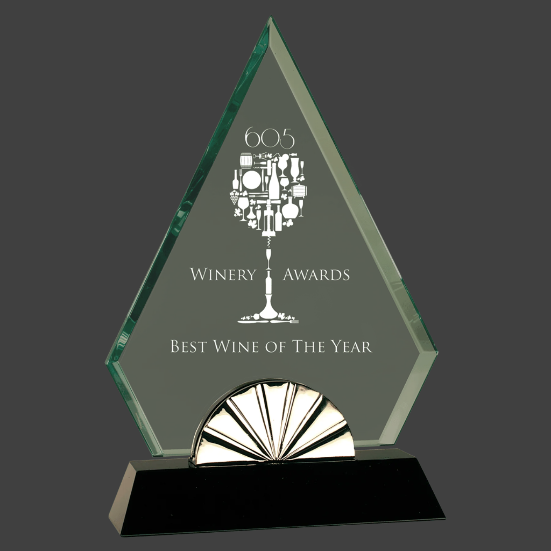 The Diamond Horizon Glass with Black Base features a sleek glass panel accented by a silver metal trim, elegantly mounted on a sturdy black glass base. Available in multiple sizes and styles, this award combines modern design with durable craftsmanship, making it an ideal choice for professional recognition or display.