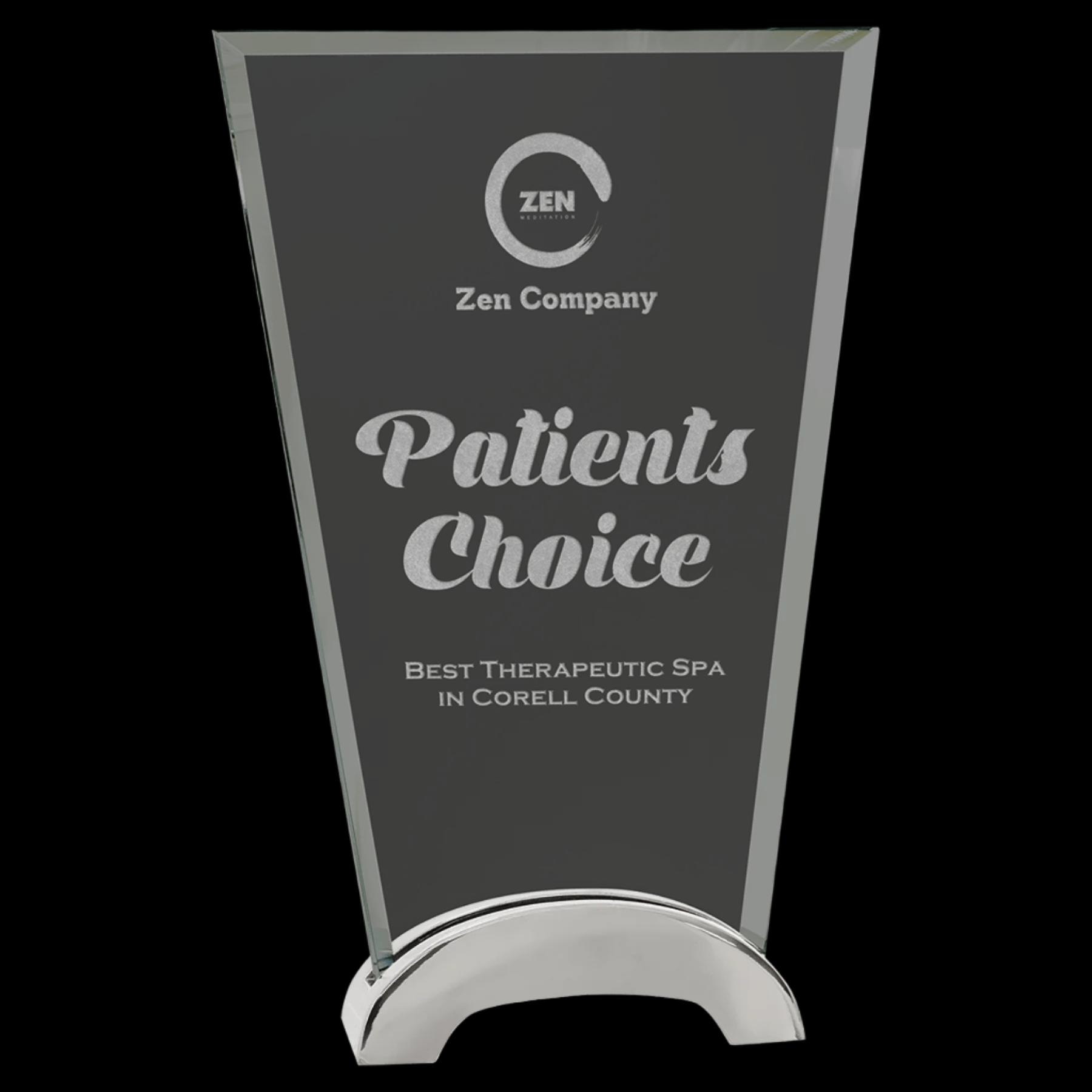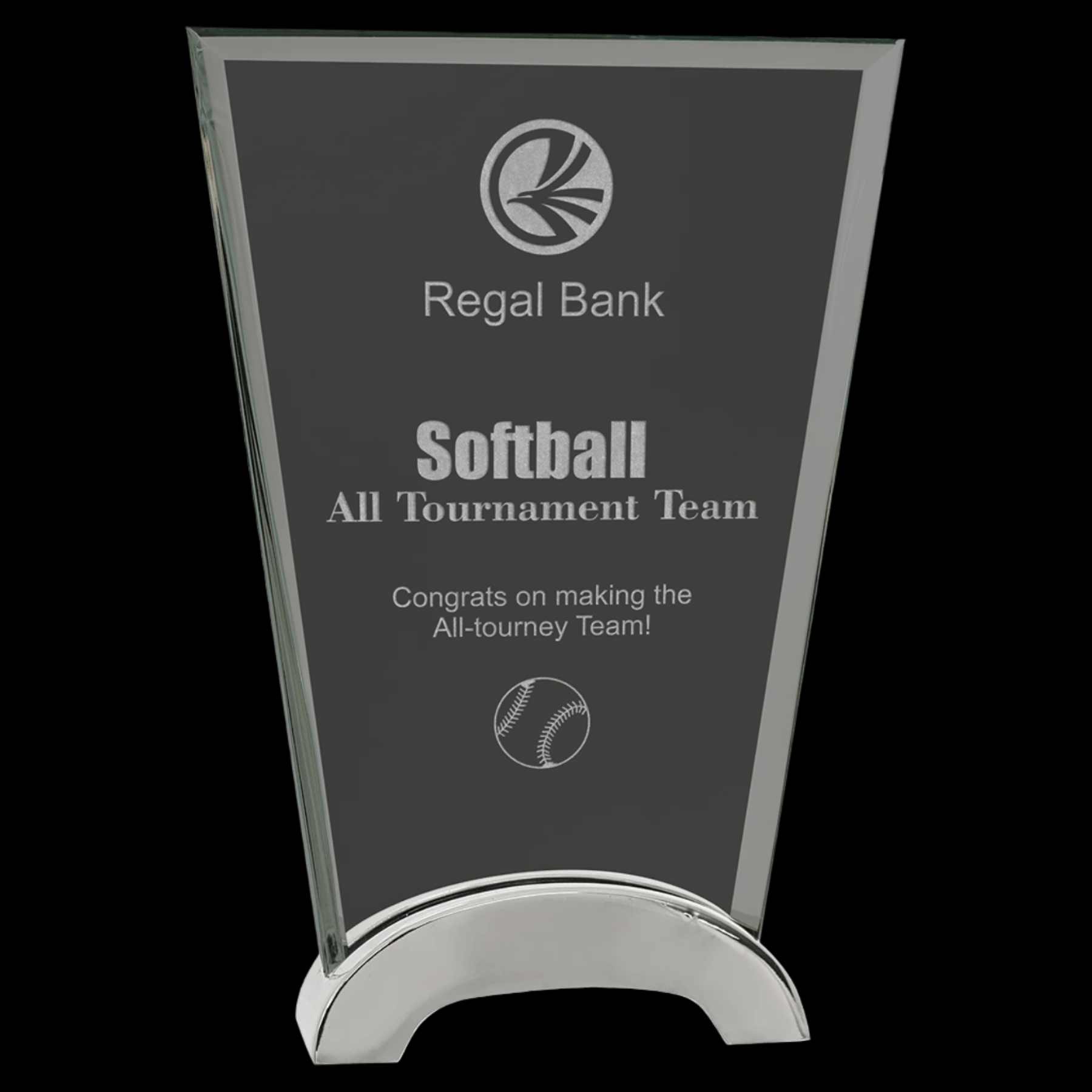 Platinum Glass is an Elegant Award Recognizing Achievements or Special Career Milestones. The Fan Shape of This Beautiful, Modern Piece Allows Plenty of Room For Personalization and the Platinum Arched Base is a Stunning Accent. Oval Platinum Glass Awards are Available in Three Sizes and Come in a Lined Blue Presentation Box For Added Elegance.