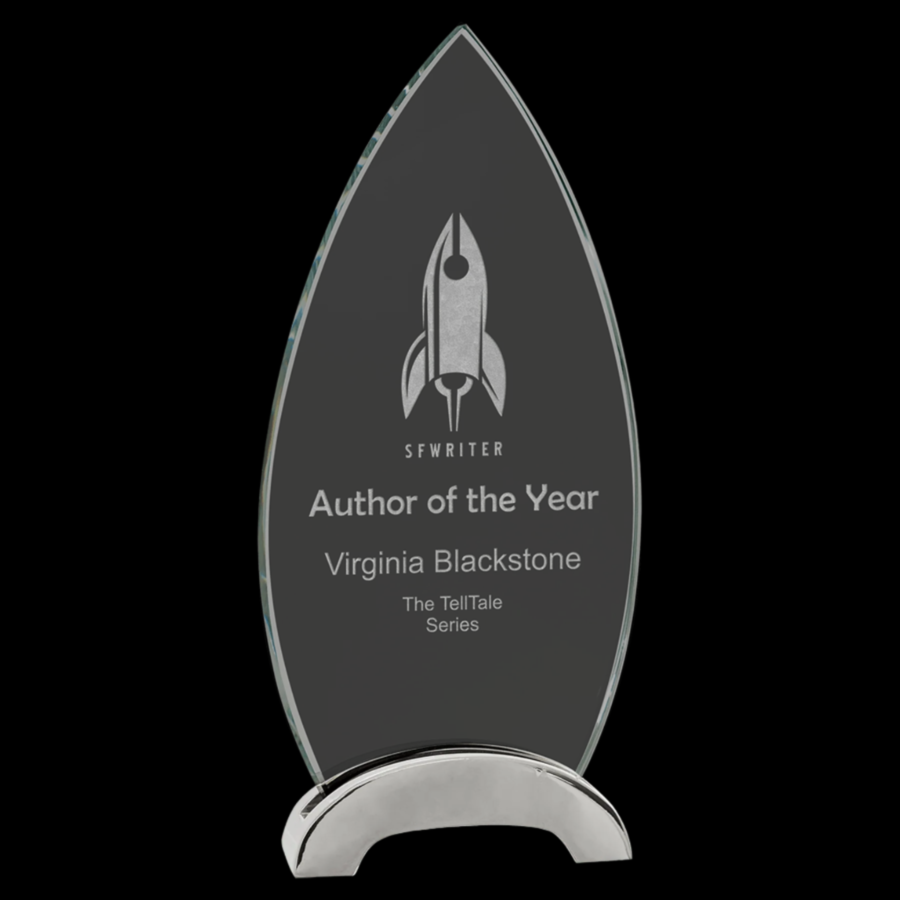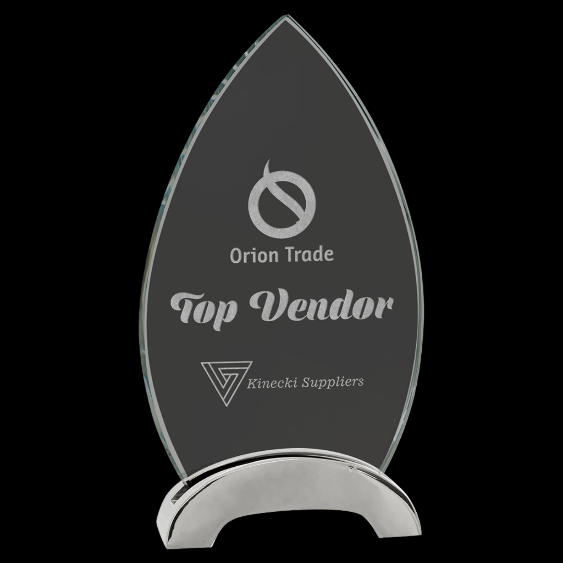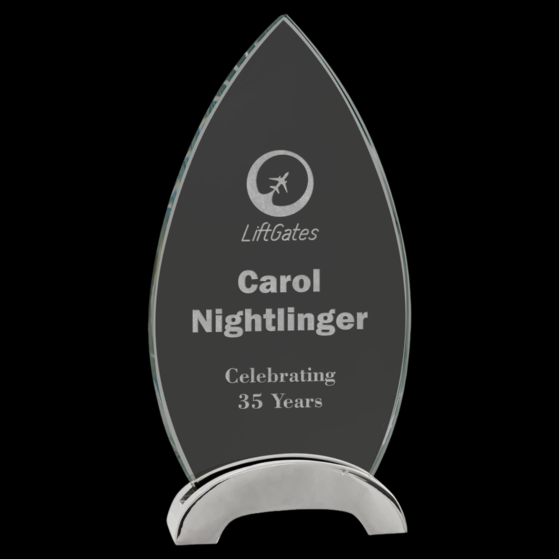 The oval shape of this beautiful, modern piece allows plenty of room for personalization and the platinum arched base is a stunning accent. Oval Platinum Glass awards are available in three sizes and come in a lined blue presentation box for added elegance.