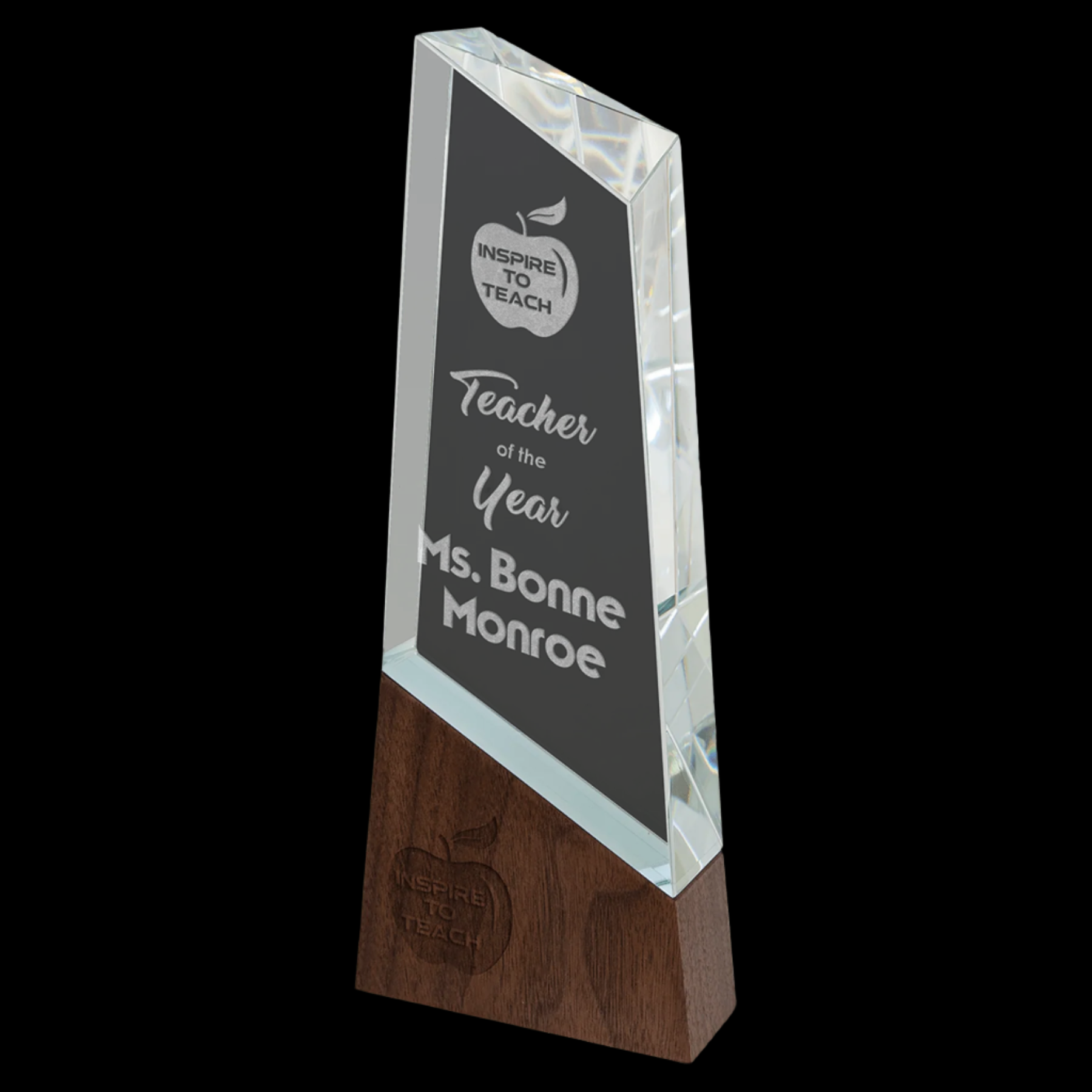 A Beautiful Glass Peak Sits on Top of an Attractive Walnut Base Creating an Award That is Perfect For Recognizing Achievement or Milestones Reached.