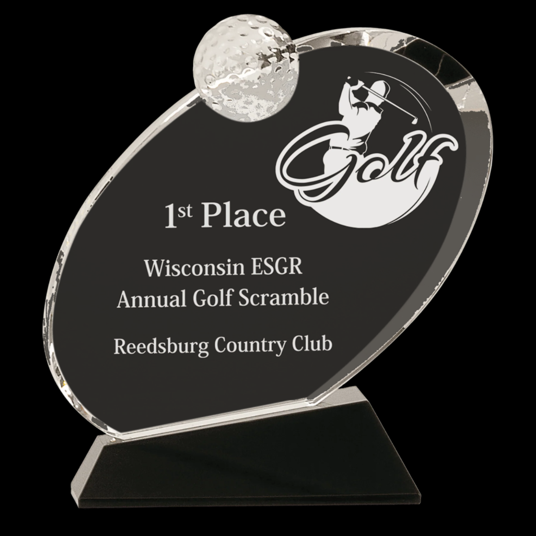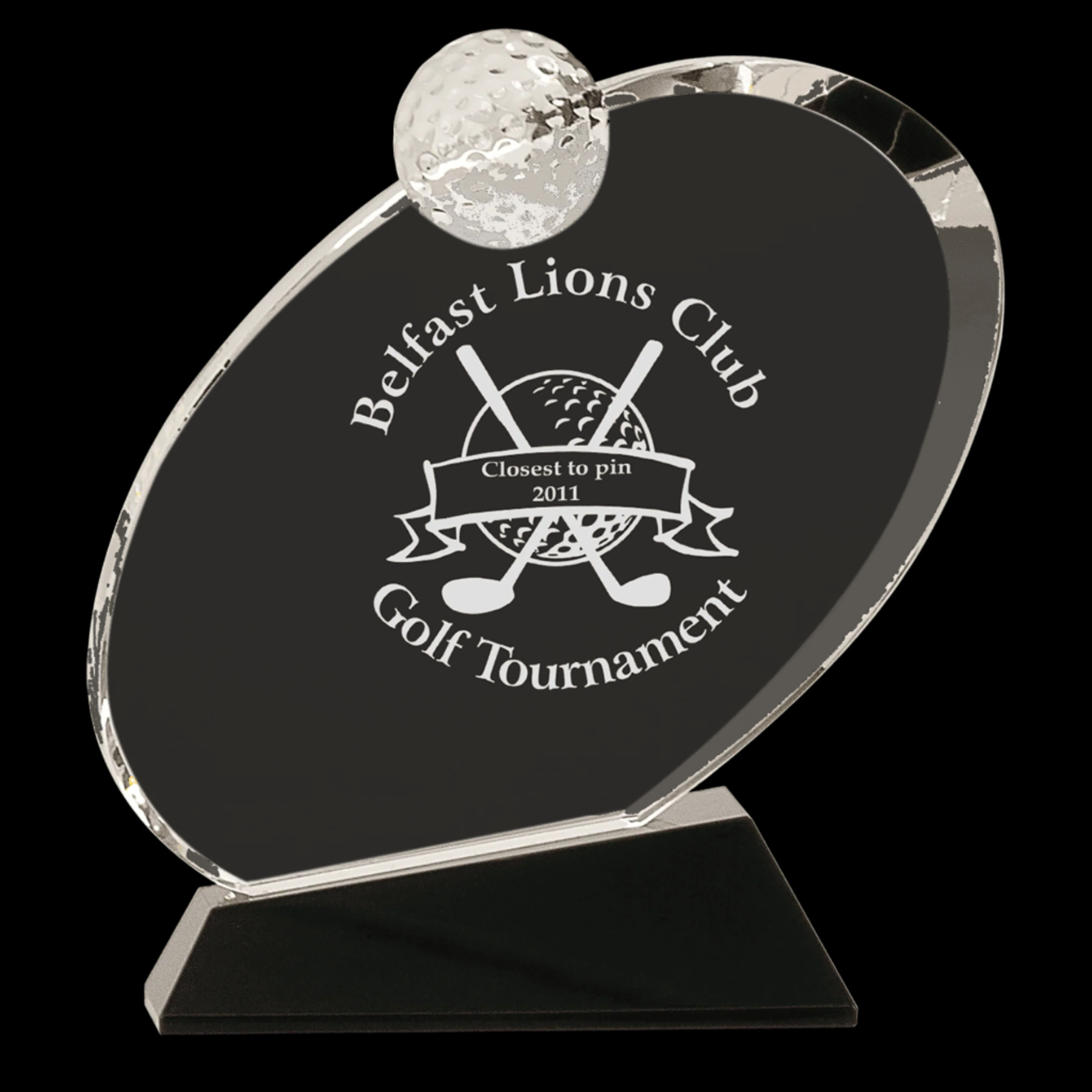 Our Golf Crystal is Handmade and May Vary Slightly in Size. Optic Crystal Oblong Golf Award Attached to Black Pedestal Base. Packaged in a Lined Gift Box.