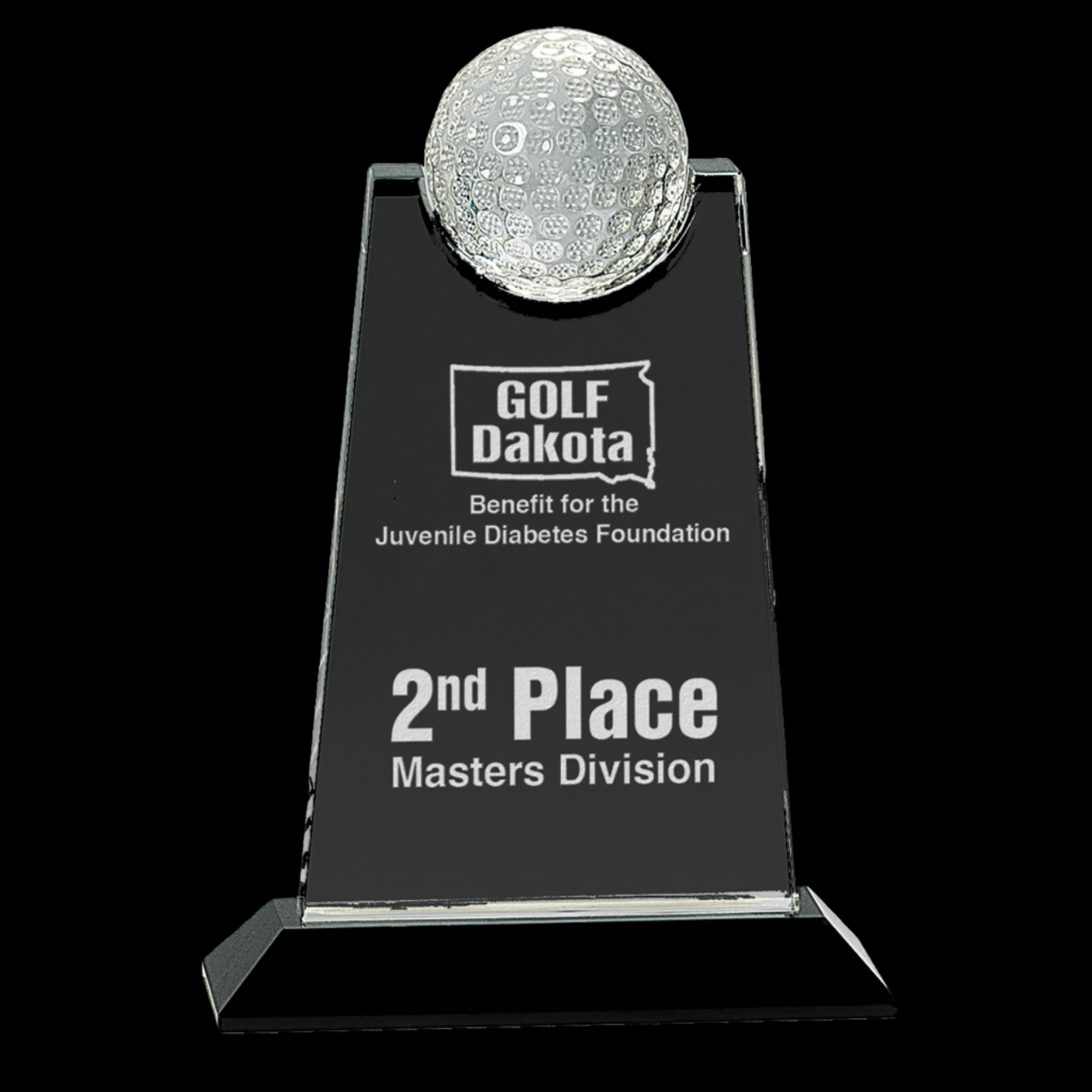 9" Clear Crystal Tablet with Inset Golf Ball On Black Pedestal Base