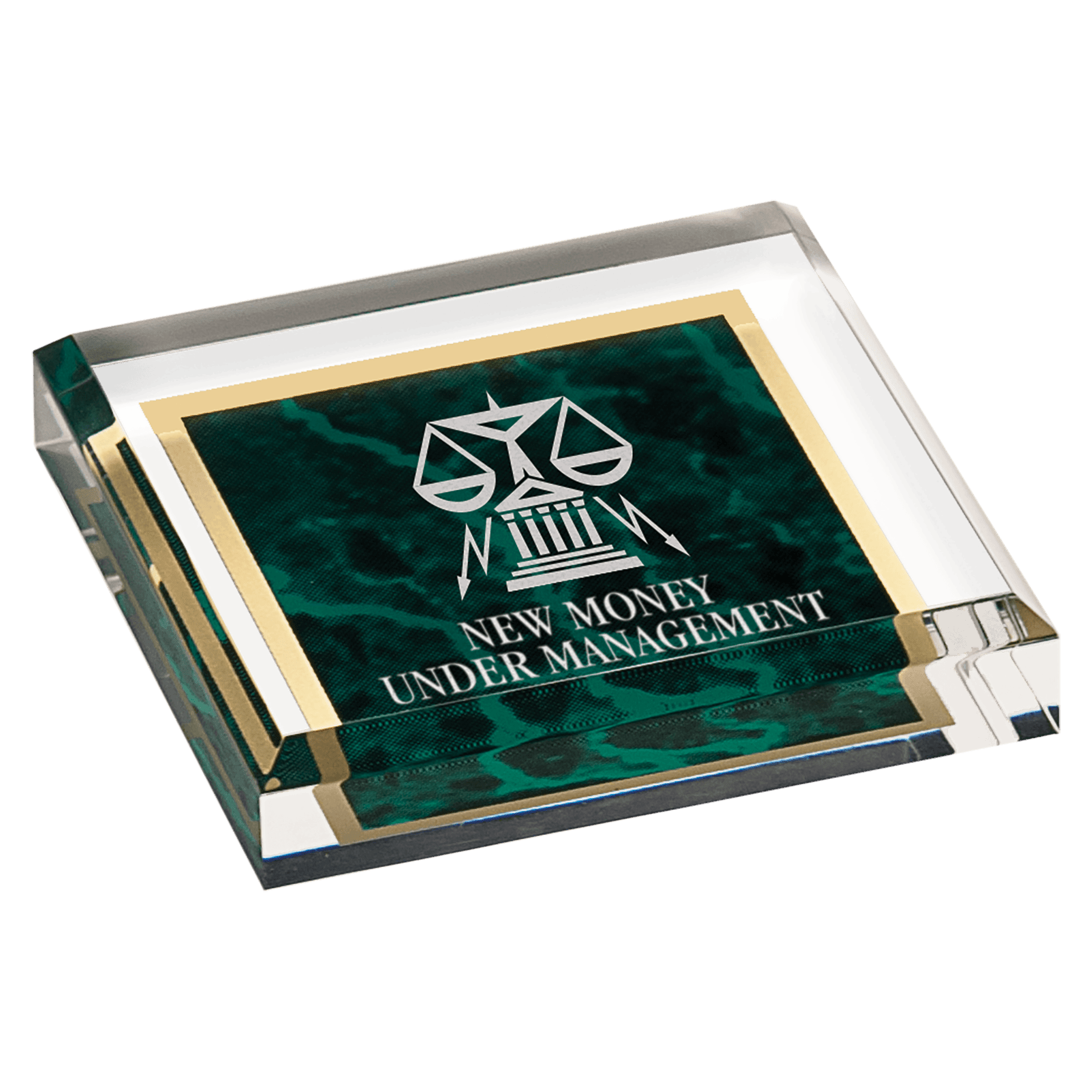 The Green Marbleized Acrylic Paperweight combines elegance and practicality in a sleek design. At 0.75 inches thick, it provides a sturdy, substantial presence ideal for professional recognition. Its distinctive green marbleized finish adds a touch of sophistication, making it a refined choice for commemorating achievements or enhancing any workspace.
