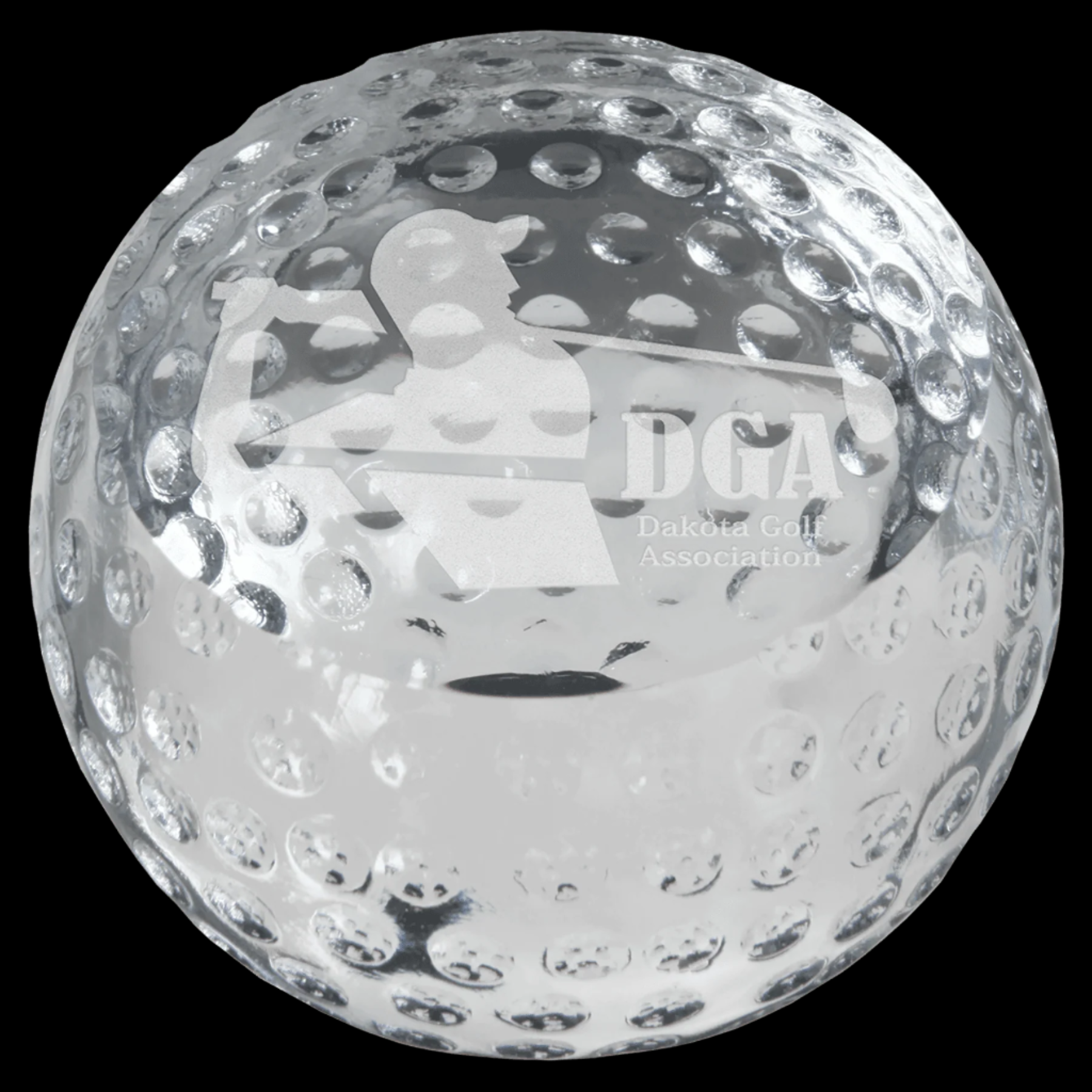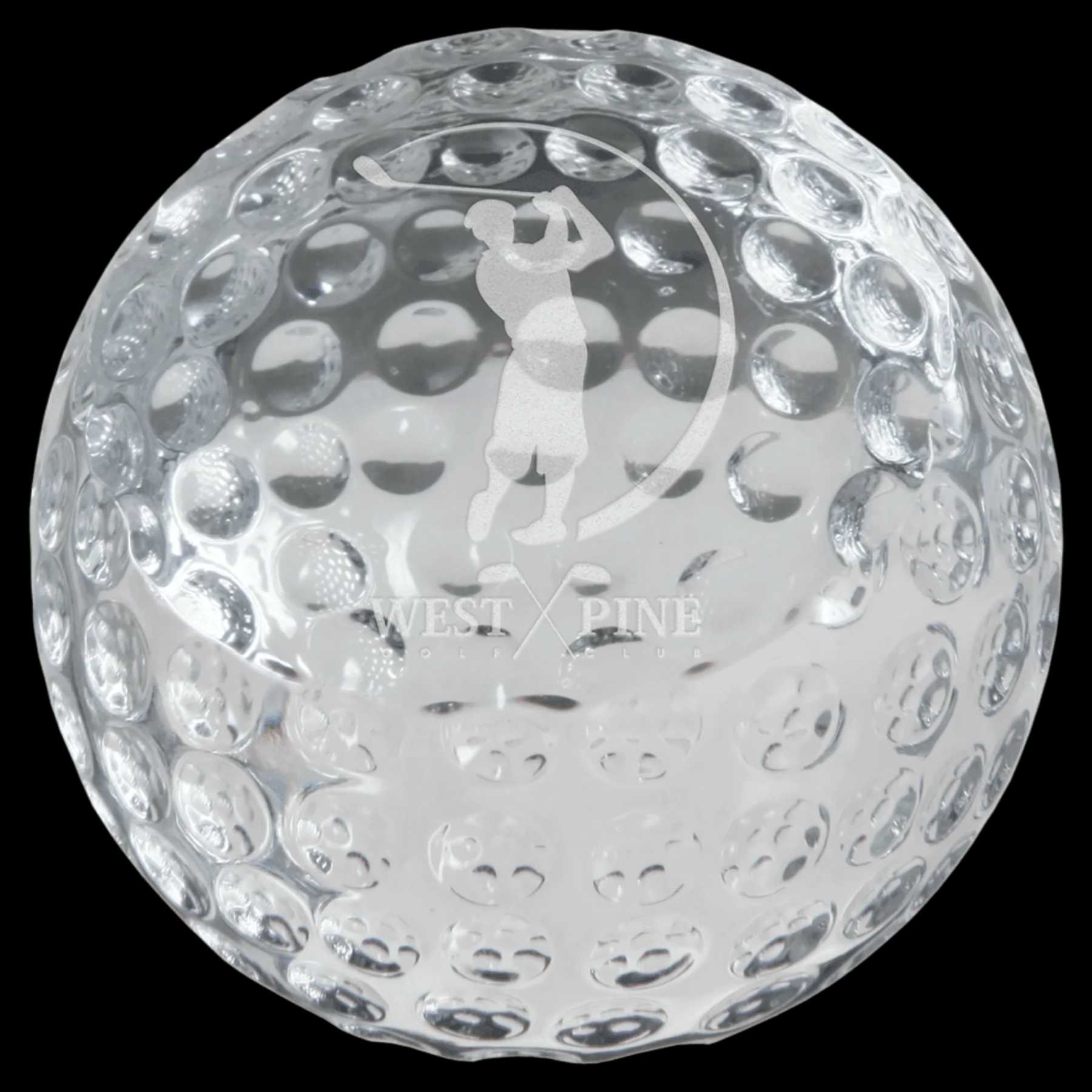 Crafted from optic crystal, this handmade golf ball paperweight offers a refined touch to any desk or office. Each piece may vary slightly in size, highlighting its unique craftsmanship. It can stand alone or be mounted on a base, making it a versatile display item. Presented in a lined gift box, it is an elegant choice for golf enthusiasts and collectors alike.