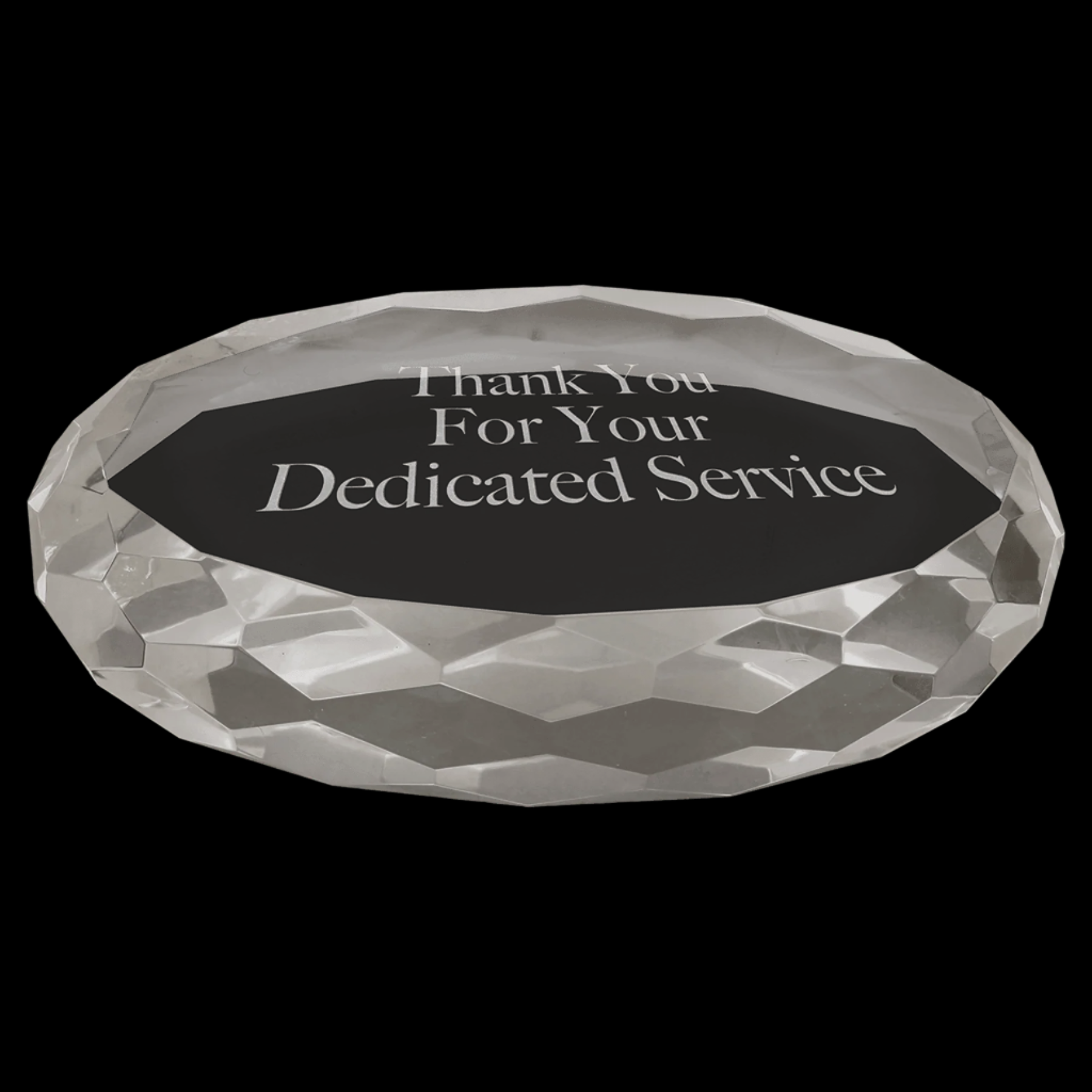 Our 4" x 2.75" Clear Oval Crystal Paperweight is expertly handcrafted from optic crystal, featuring precise facet edges that enhance its clarity and elegance. Each piece may vary slightly in size, reflecting its handmade nature. Presented in a lined gift box, it makes a refined and thoughtful gift while providing a functional, stylish way to keep your documents secure.
