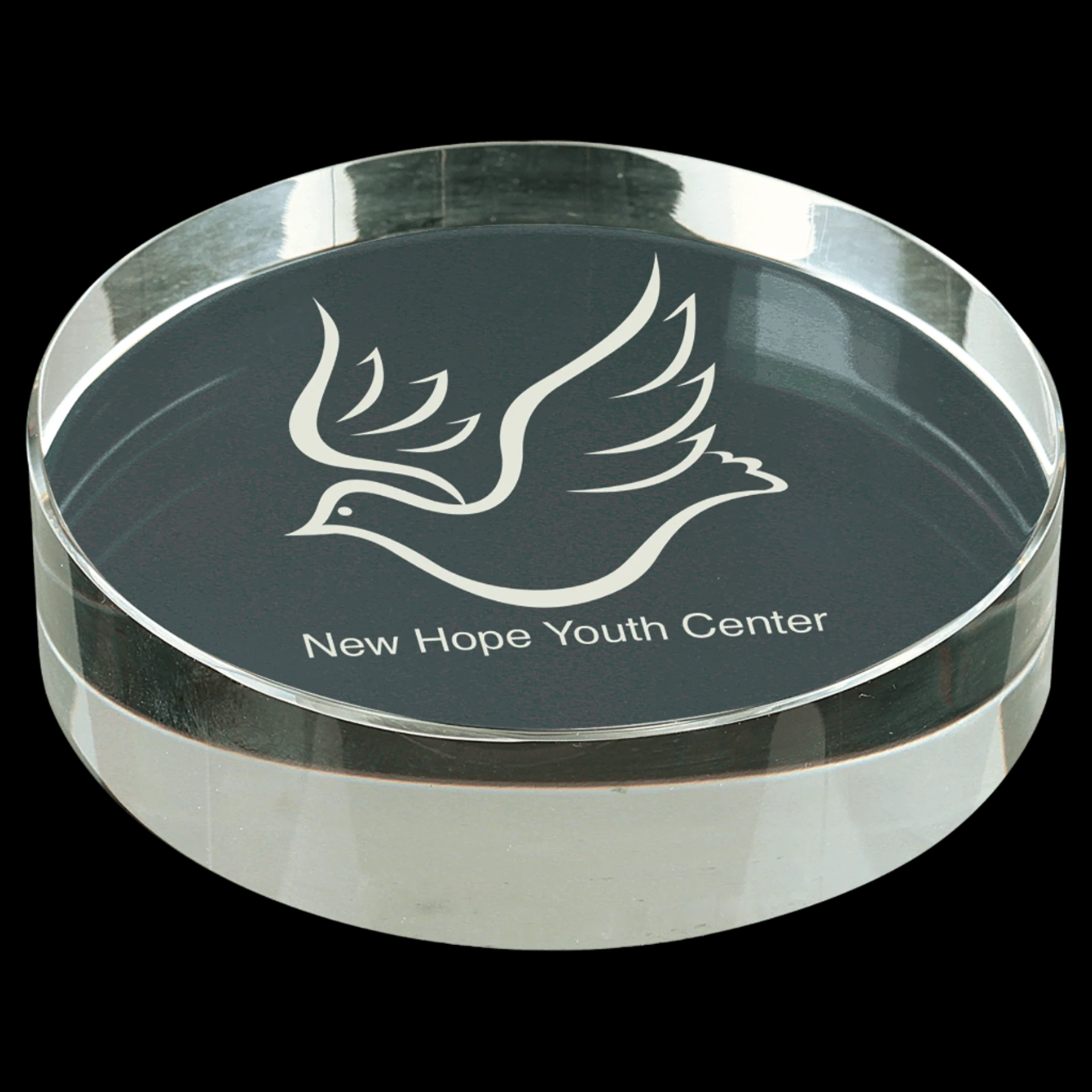 Our 3.125" Crystal Round Paperweight features a slight bevel edge and is crafted from optic crystal for clarity and elegance. Each piece is handmade, resulting in subtle size variations that add to its unique character. Presented in a lined gift box, it makes a refined and thoughtful gift or desktop accessory.