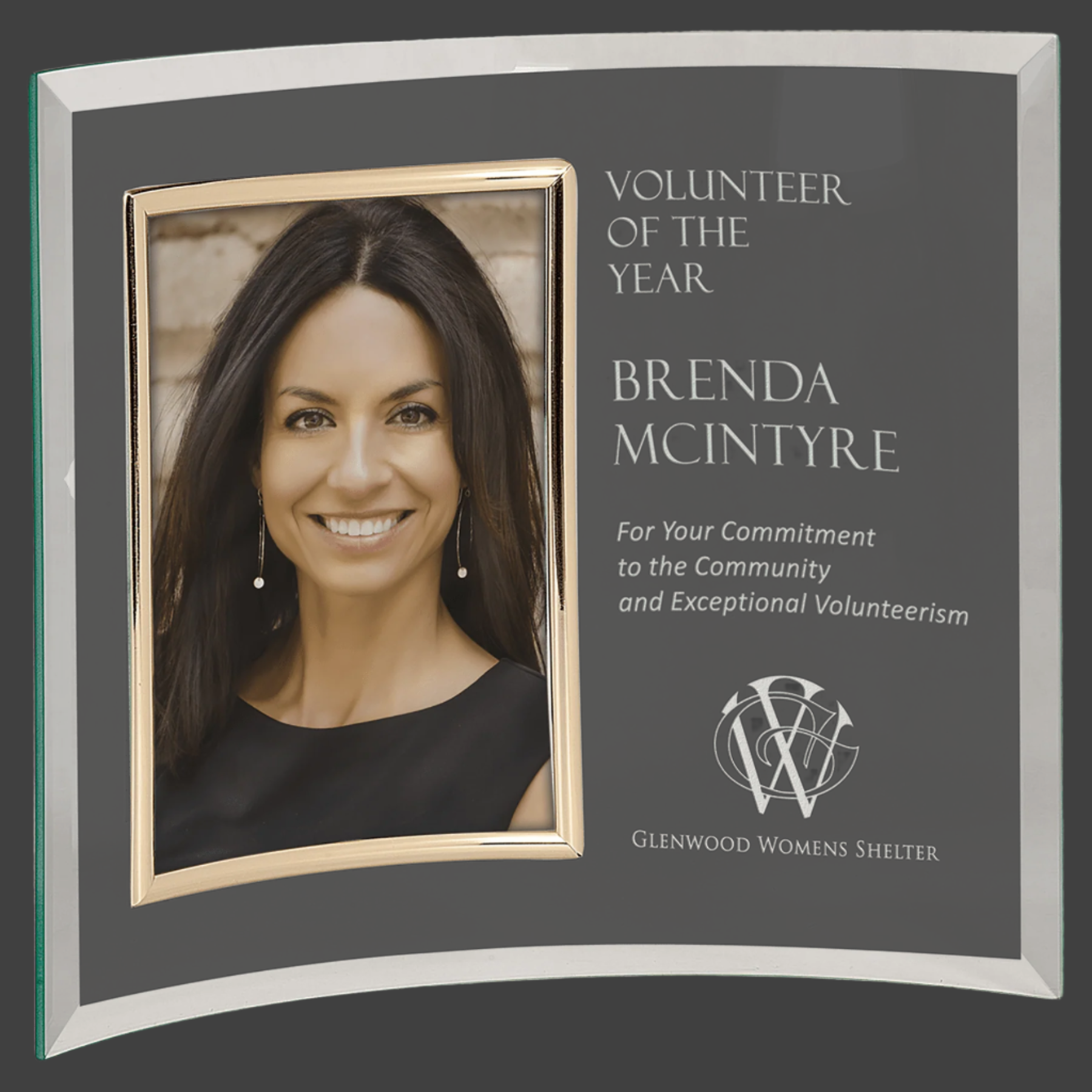 This 12" x 10" Jade Glass Crescent features a 5" x 7" picture frame, crafted with .25" thick jade glass for durability and a refined aesthetic. Its sturdy construction ensures lasting quality while showcasing your photos with elegance. Ideal for both personal display and professional settings.