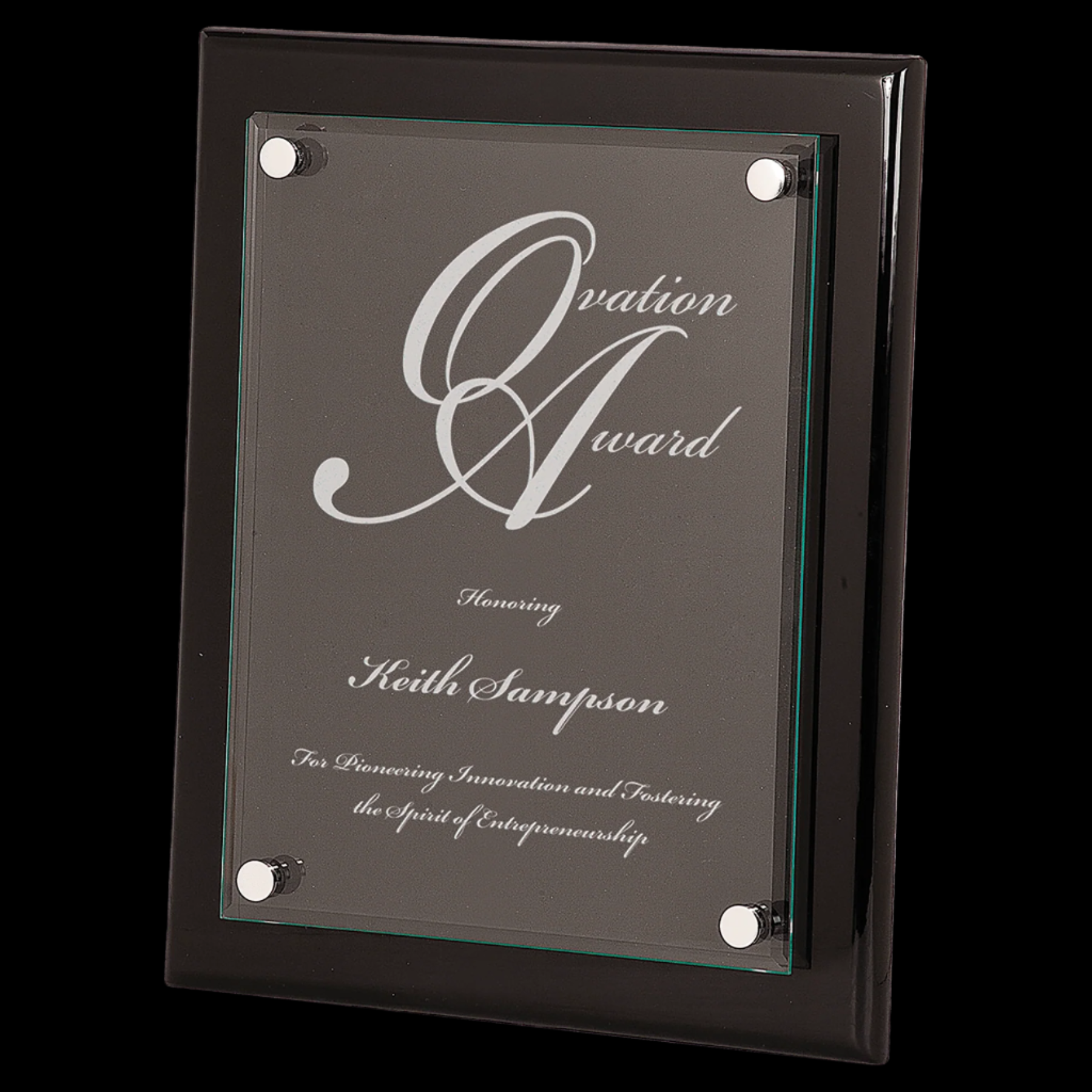 Elevate your awards and recognitions with the Black Piano Finish Floating Glass Plaque. Featuring a sleek .1875" thick glass panel that floats .25" above the plaque surface, it creates a striking dimensional effect. The felt backing adds a refined touch of elegance, while the high-gloss black piano finish ensures a sophisticated presentation suitable for professional settings.