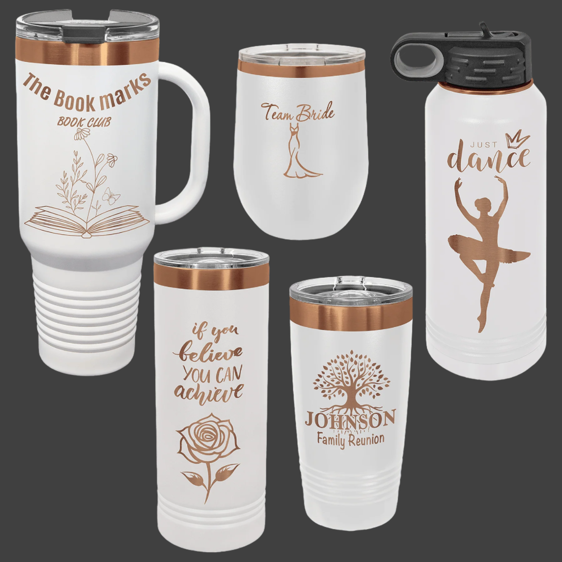 This Sample Set Includes One Each of the White/Rose Gold Polar Camel Drinkware. Get One of Each Style Available in This Color Combination, the 12 oz. Stemless Wine Glass, 20 oz. Tumbler with Slider Lid, 22 oz. Skinny Tumbler, 40 oz. Travel Mug with Handle, and the 32 oz. Water Bottle.